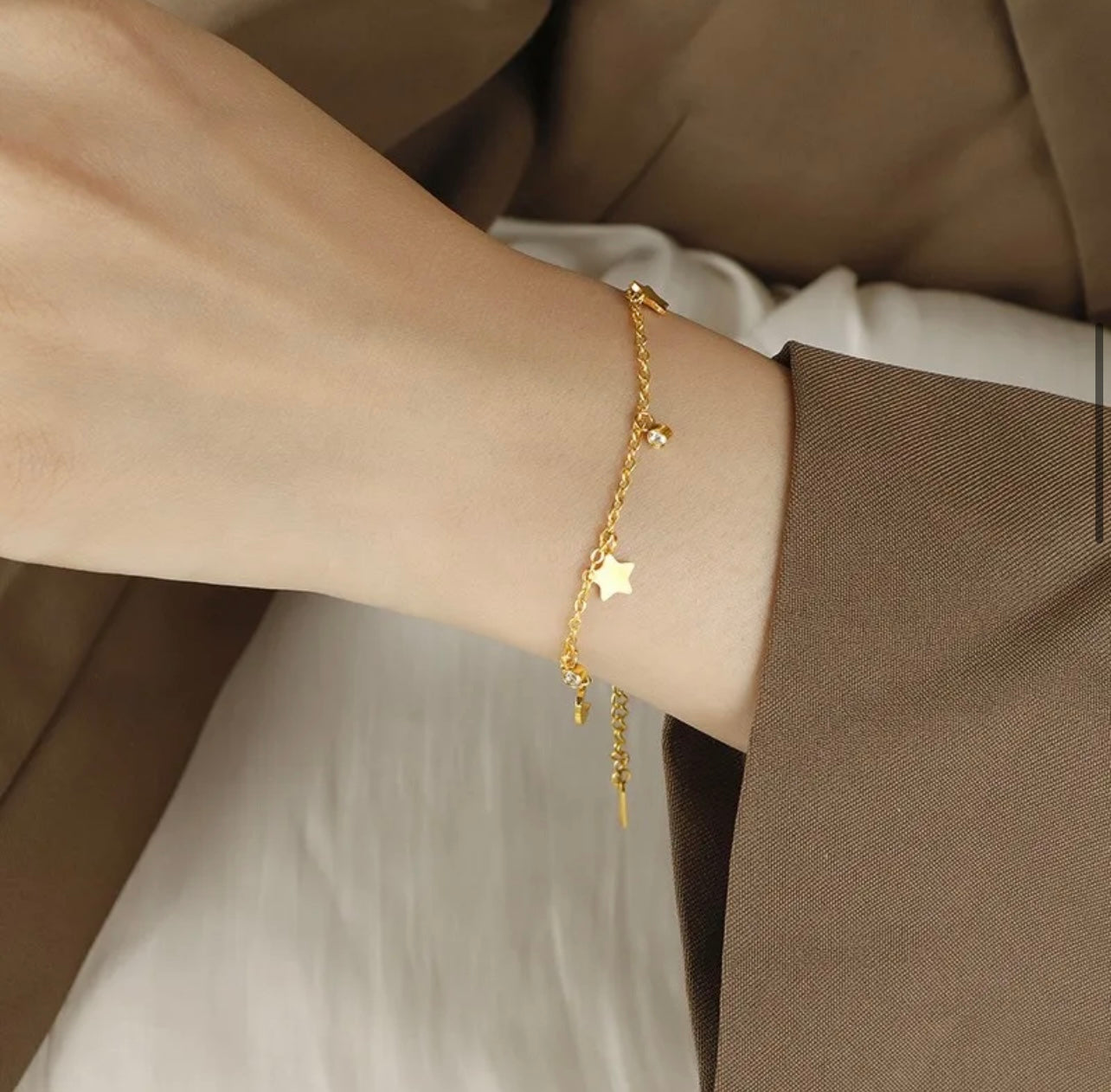 Bring the magic of the night sky to your wrist or ankle with this exquisitely dainty Celestial Dangle Charm piece. This accessory features 18k gold-plated stainless steel,adorned with scattered, shimmering charms.