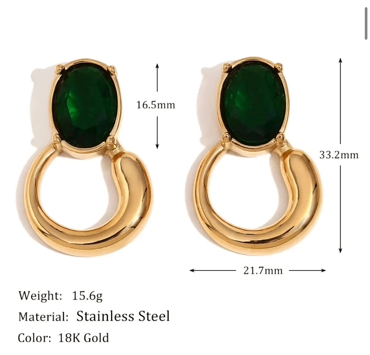 Bold color meets sculptural gold. These striking earrings feature a luminous, oval-cut deep black crystal stud, set in a sleek 18k gold plated stainless steel bezel. Suspended beneath is a chunky, high-polish partial hoop element. This piece perfectly balances the timeless elegance of a colored stone with a modern, substantial drop silhouette. Secured with a post-back closure. It is waterproof and anti tarnish.